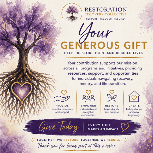 General giving supports the full scope of Restoration Recovery Collective’s work. Donations help fund programs, resources, outreach, and operational needs, allowing us to respond to real-time needs and continue building sustainable support across all initiatives.